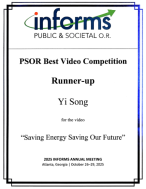 2025年10月26至29日,INFORMS(国际运筹学与管理学研究协会)年会在美国亚特兰大举办。清华大学能源环境经济研究所张达长聘副教授与康奈尔大学约翰逊商学院崔耀副教授的合作研究成果《绿色干预与用户行为:一项针对智能控制的随机对照实验》获得公共与社会运筹学(PSOR)分会最佳研究视频展示奖(PSOR Best Video Competition)第二名。该奖项旨在表彰领域中以创新方式展示公共与社会运筹学研究的优秀工作,从而促进学术共同体的交流与发展,并推动相关成果在合作伙伴及更广泛群体中的宣传。