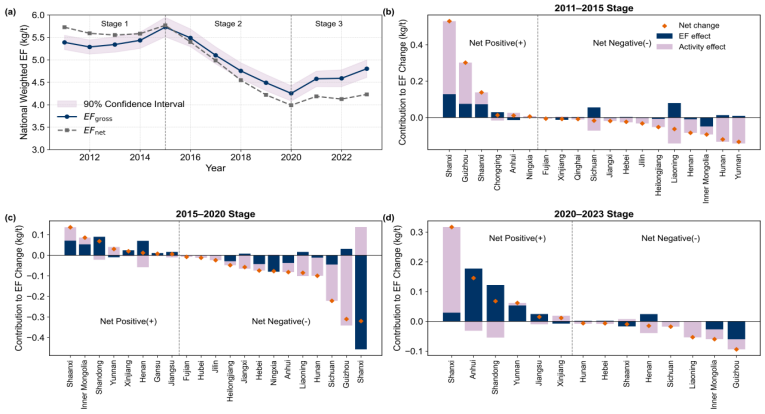 图1. 全国煤矿甲烷排放因子的时间变化及省级贡献分解。(a)显示全国加权平均排放因子呈现“上升—下降—反弹”的三阶段特征;(b-d)展示了不同阶段各省份对排放因子变化的驱动贡献