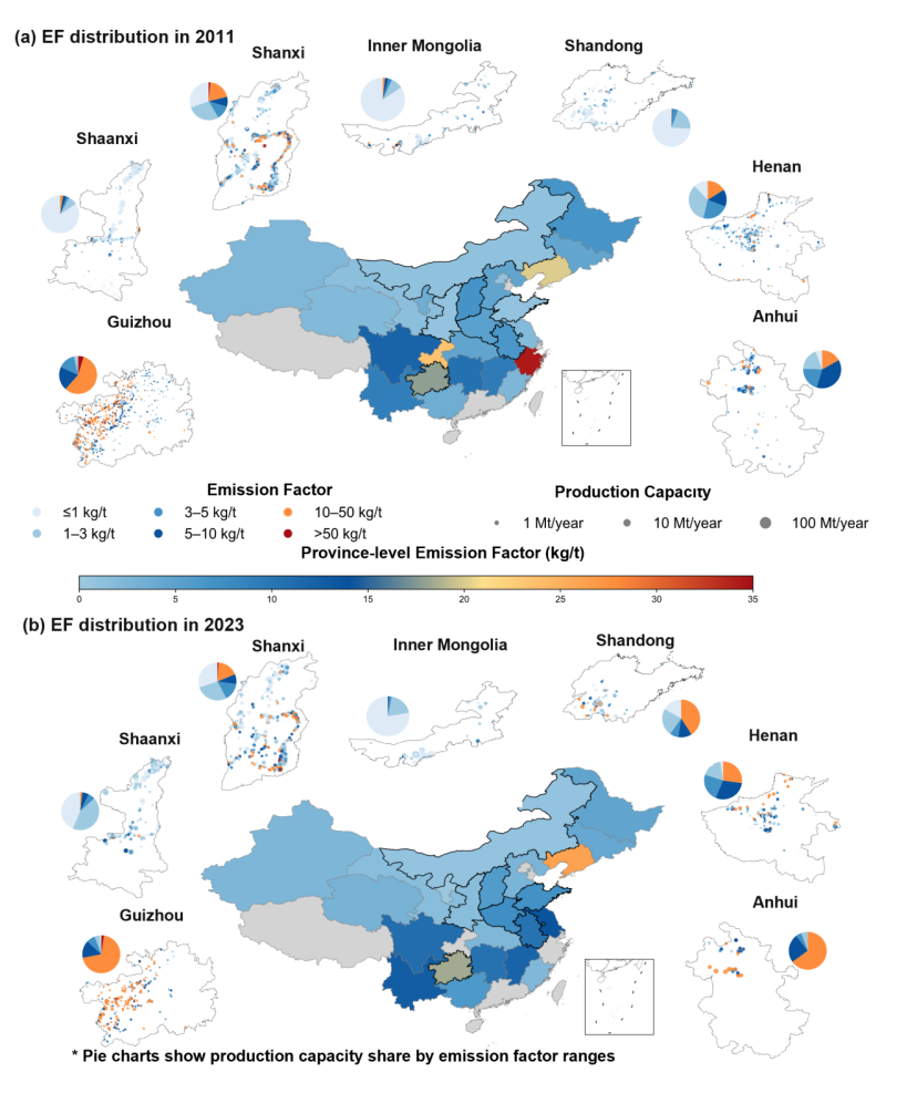 图2. 煤矿甲烷排放因子的空间分布变化(2011 vs 2023)。饼图展示了主要产煤省份不同排放强度产能的占比
