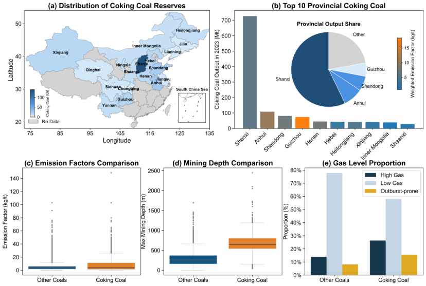 图3. 炼焦煤资源分布、煤种结构与瓦斯条件。焦煤矿井普遍埋深更大、瓦斯突出风险更高,是减排的难点领域